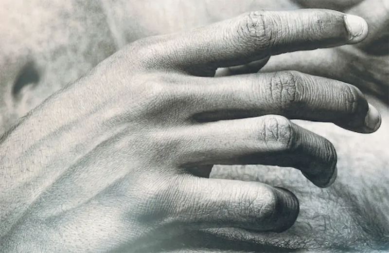 Increíble también es que este trabajo y trazado, tan fino, hasta nervioso y compulsivo, se hizo, con grafito y carbón sobre papel de Arches, un soporte insuperable. ¡Gris, blanco, negro, y cuántos matices! Que produzca una ilusión de tinta es la magia menor… ya que se nos olvida que la piel, a la vez carnal o translúcida, tiene color. Estos cuerpos, tan bien construidos en su casi integralidad o sus detalles captados en “close-up”, vibran, tienen ritmo y líneas de fuerza. ¿Estará el movimiento detenido, el equilibrio estricto, la observación anatómica, definida y definitiva?